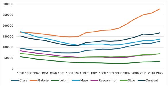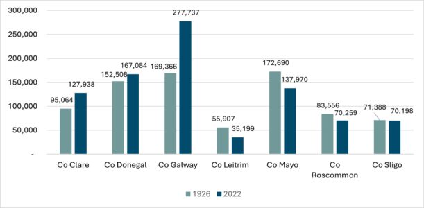 While the population of three Western Region counties is still well below that in 1926 (Leitrim 37% lower, Mayo 20% lower and Roscommon 16% lower) other Western Region counties grew more significantly, with the population of Galway 64% more than in 1926, and Clare 35% higher, while Donegal had almost 10% more people in 2022 than in 1926.
