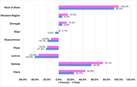 Population growth has also varied among males and females in the Western Region counties (Fig 7), with the female population in all counties either growing by more (Donegal, Sligo, Galway and Clare) or declining by less (Roscommon, Mayo and Leitrim) than the male population.