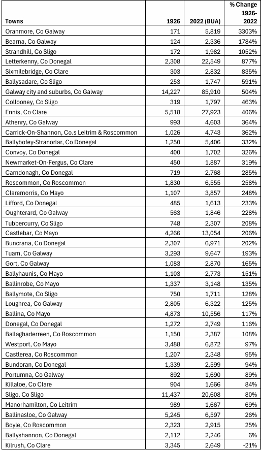 Table 1 below shows the population of Western Region towns which were larger than 1,500 in 2022 (and hence classified as urban). The fastest growing are mostly dormitory towns around Galway, Sligo and Limerick, although Letterkenny showed exceptional growth too with an increase from 2,308 in 1926 to 22,549 in 2022. Interestingly, in 1926 Buncrana (2,307 in 1926) was the same size as Letterkenny, while Ballyshannon (2,112) was almost the same. In the last century while Letterkenny grew by 877%, the population of Buncrana grew by 202% (to 6,971 in 2022) and Ballyshannon has struggled to maintain population with only 6% growth between 1926 and 2022 (2,246 in 2022), the second lowest for a Western Region town.